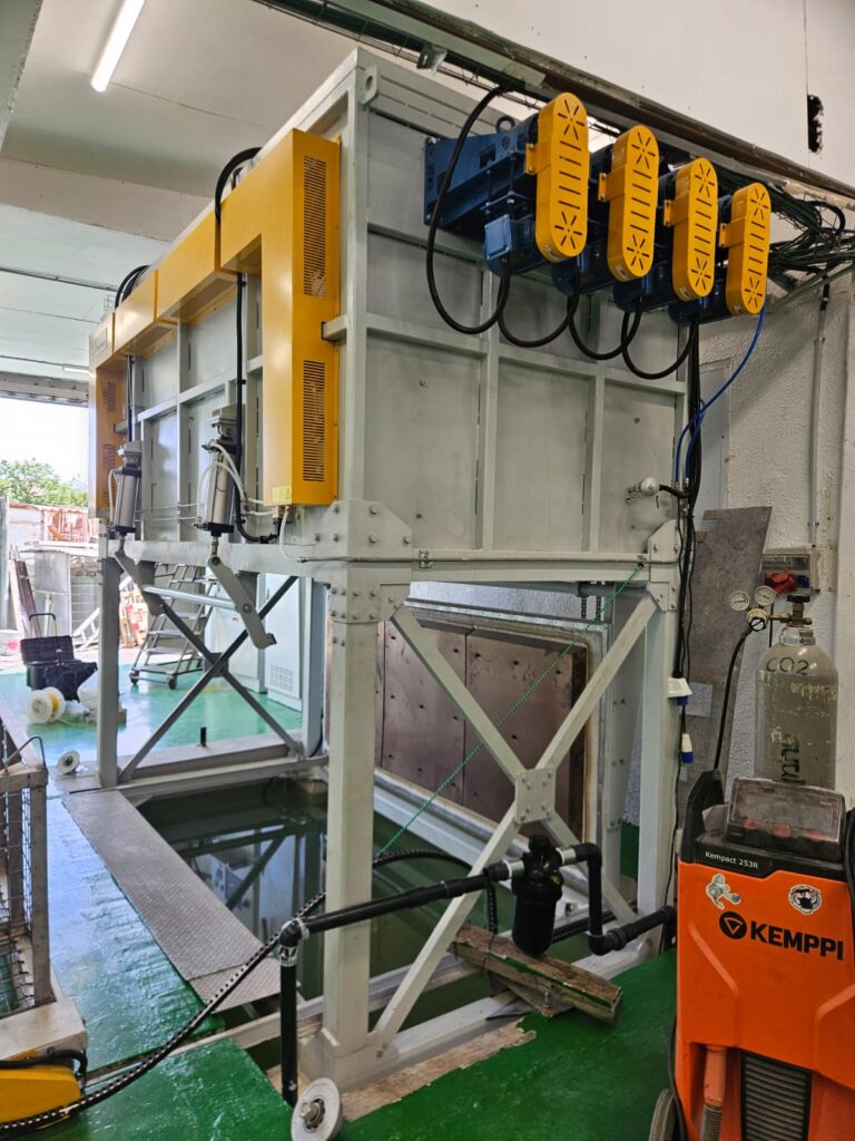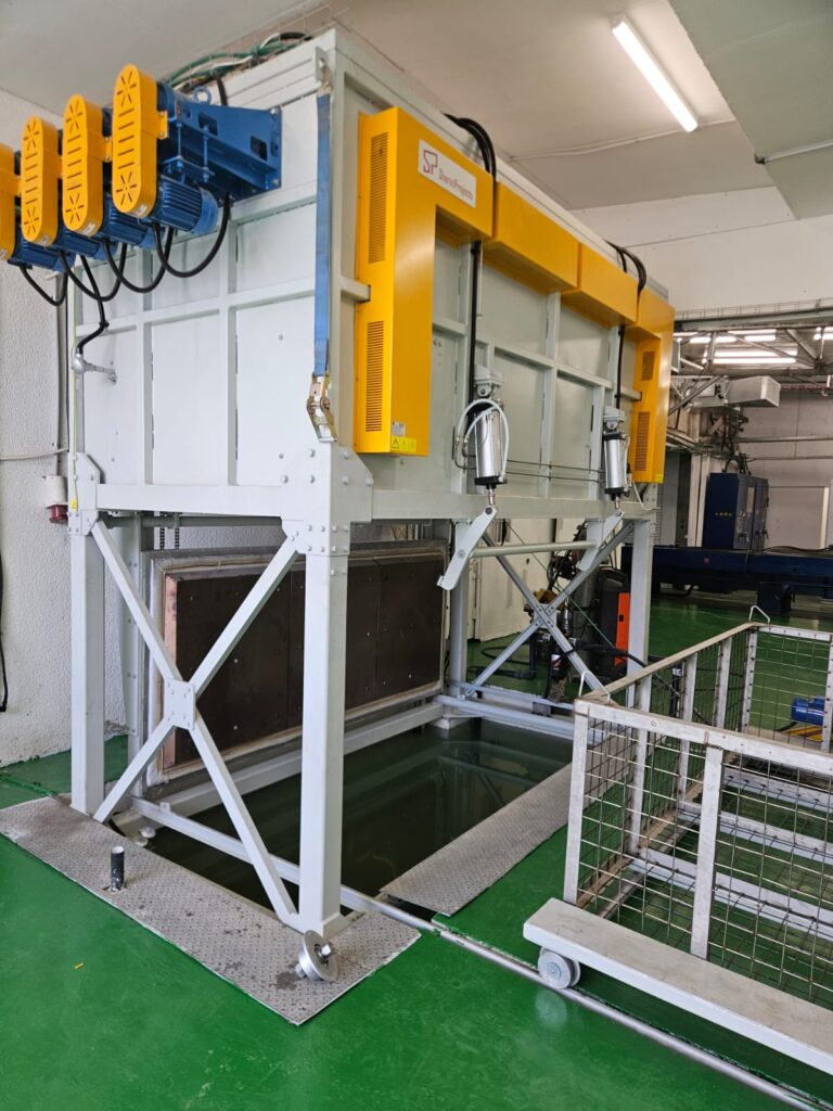 התנור משלב סל תעשייתי המשמש להפלה מהירה למיכל מים, כחלק מתהליך שוק תרמי (Quenching) – לצורך קירור מיידי ושיפור תכונות החומר.